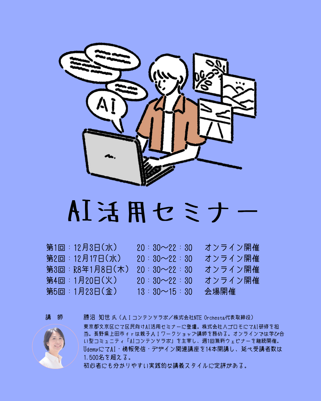 | その他備考 | セミナー内容 ■ 第1回:12月3日 20:30~22:30 AIの基礎知識とプロンプト(指示文)入門 □ 第2回:12月17日 20:30~22:30 情報発信媒体と導線設計 ■ 第3回:令和8年1月8日 20:30~22:30 情報発信のための戦略立案 □ 第4回:令和8年1月20日 20:30~22:30 コンテンツ作成の実践 ■ 第5回:令和8年1月23日 13:30~15:30 実践応用と振り返り・まとめ |